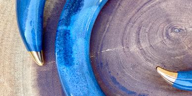 the gold luster is applied and the piece is fired briefly again. When the oil burns off in the kiln,
